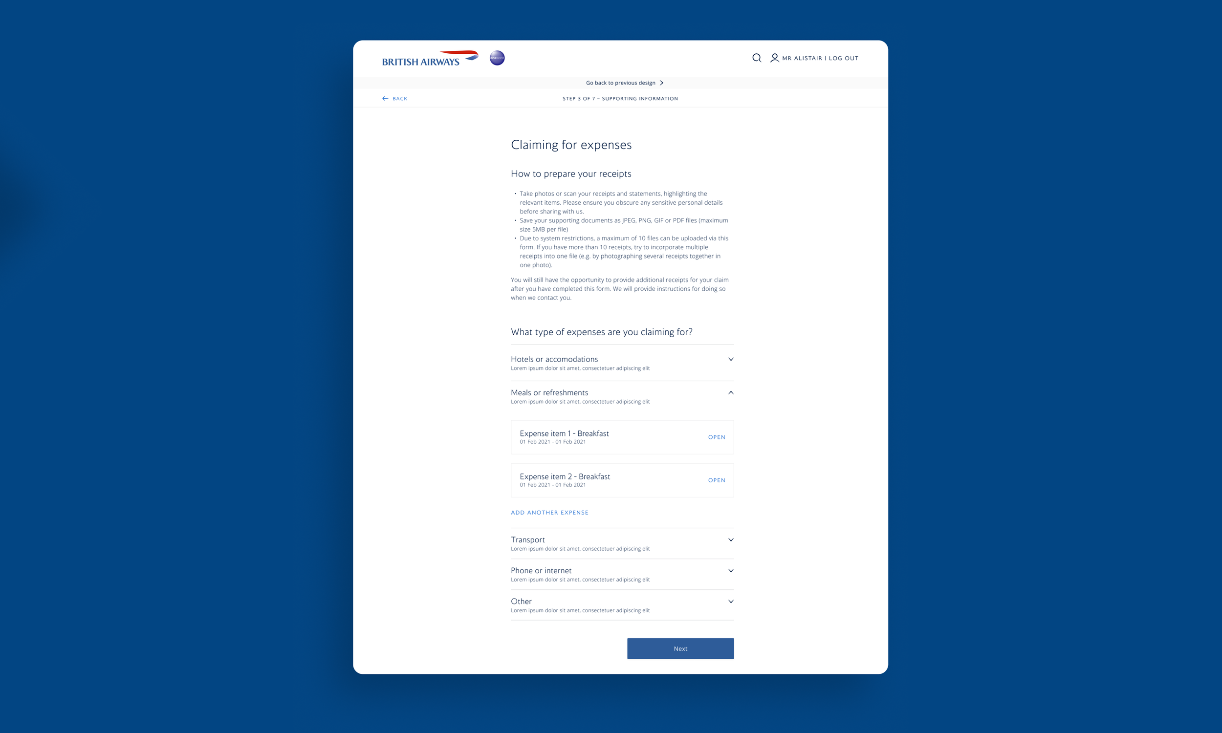 I was able to successfully redesign the flow using the components in the new Design System, whilst simplifying the process, by adding some new features e.g. saving multiple expense items and being able to go back and edit, remove them from the overall claim without losing data, and undoing the removal.