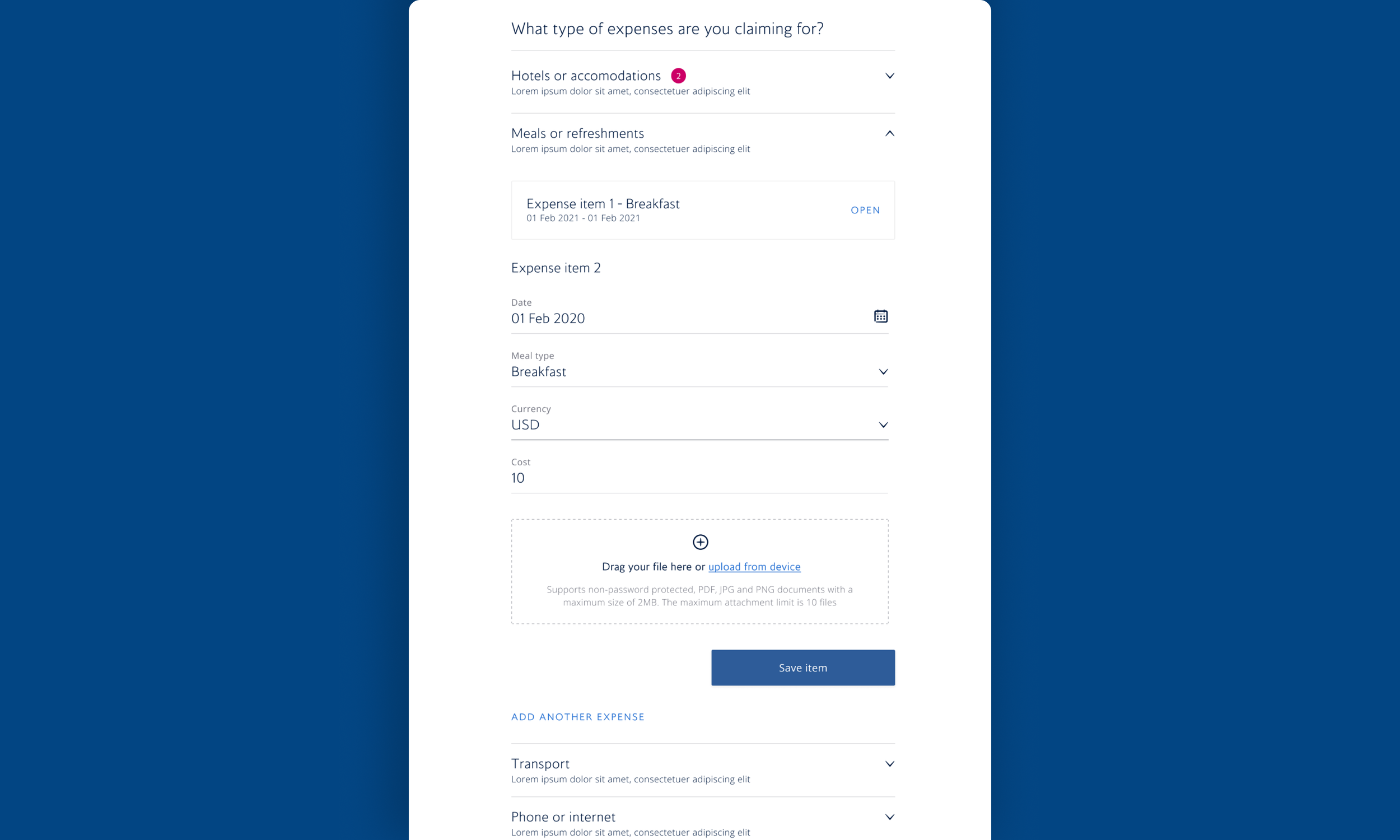 In order to raise multiple claims a customer would have to get to the end of a single expense transaction to then add another expense type to their claim. To address this I designed a feature where customers save their expense within the form and then add another expense. Within this feature, I enabled customers to see their saved expense item, open it for editorial purposes and to remove it in the event they added the expense item in error.