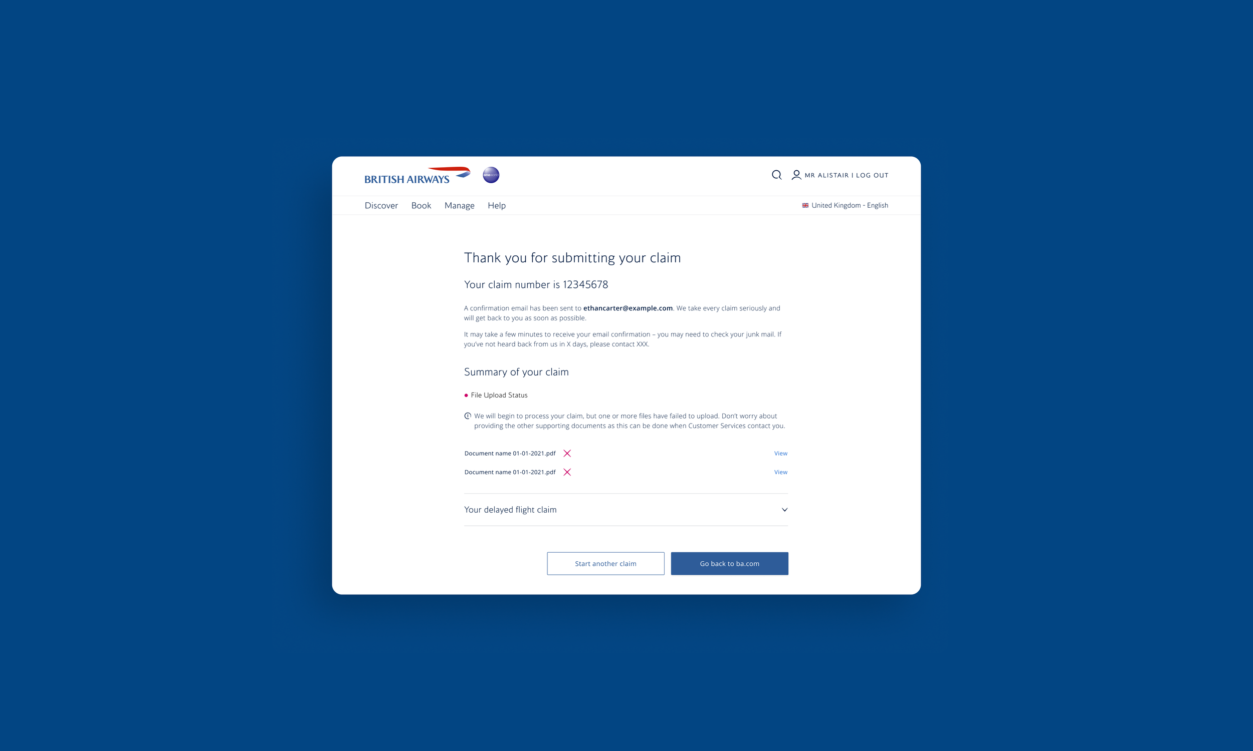 I also Summary page that allowed customers to see the full details of the claim they had submitted. There was a requirement for this page to show customers if any attachments didn’t load successfully and inform them that the claim will process will begin, and supporting documents can be provided once Customer Services contact them. I designed this so customers could see the actual document itself.