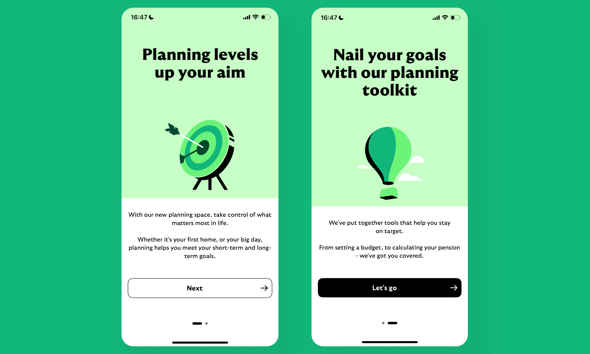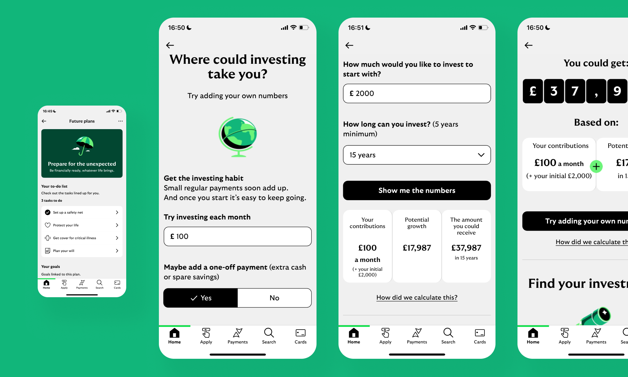 Some of the non-AI concepts I designed for the Plan My Future proposition were adopted for the initial release of the Start Investing tab, shaping elements of the first customer-facing experience.