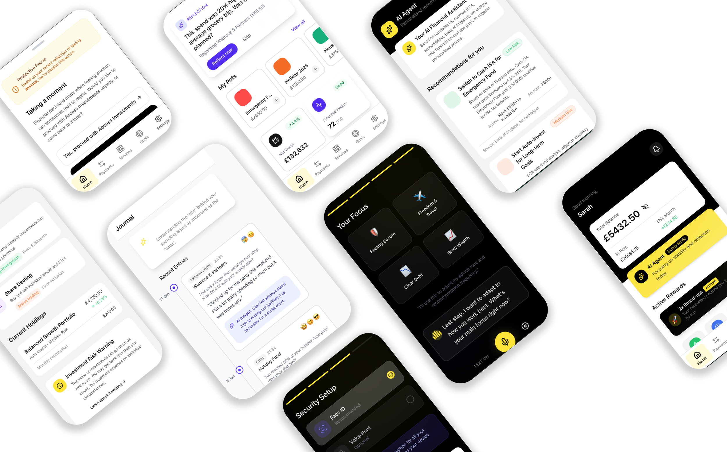 After years working across design and financial services, I wanted to rethink what "banking" actually means for ordinary people. Most apps obsess over transactions and growth metrics. Very few look at behaviour, emotion, and long-term wellbeing. This project imagines a multimodal, AI-assisted banking experience that's as empathetic as it is powerful — combining everyday payments, savings, goals, investing, borrowing, and pensions into a single operating system that helps users make better decisions, protects them when they're vulnerable, and motivates them when they're on track.